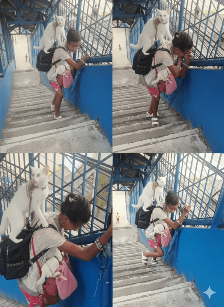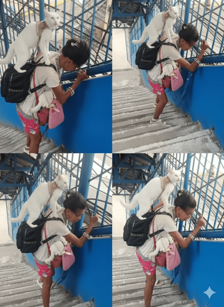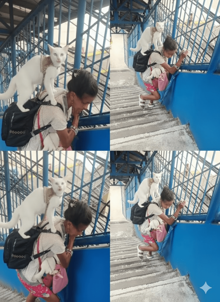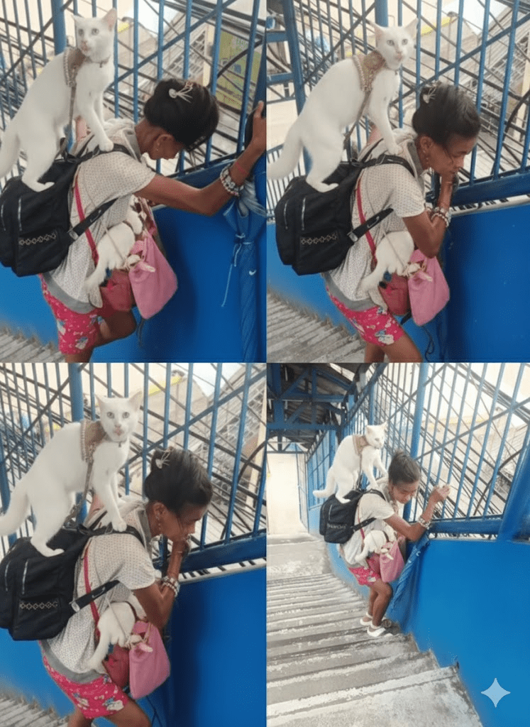 In a world often fixated on grand narratives and spectacular displays, there are countless quiet acts of love and dedication that unfold daily, often unnoticed by the bustling world around them. The image captures one such profound moment: a person, presumably a woman, ascending a flight of stairs, not merely burdened by her own journey but by the precious lives she carries. Perched on her backpack is a pristine white cat, its gaze intelligent and serene, adorned with what appears to be a delicate collar. In her arms, cradled in a pink sling or bag, are multiple tiny kittens, their vulnerability palpable. This tableau is more than just a snapshot; it is a poignant testament to unconditional care, resilience, and the deep, often complex, bonds that form between humans and animals. It speaks to a level of commitment that transcends convenience, highlighting the sacrifices made and the responsibilities shouldered out of sheer affection. The worn steps, the simple attire, and the focused demeanor of the individual all underscore a life lived with purpose, where the well-being of these creatures is paramount. It invites us to look beyond the surface, to consider the stories behind such moments, and to recognize the quiet heroism in everyday acts of devotion.