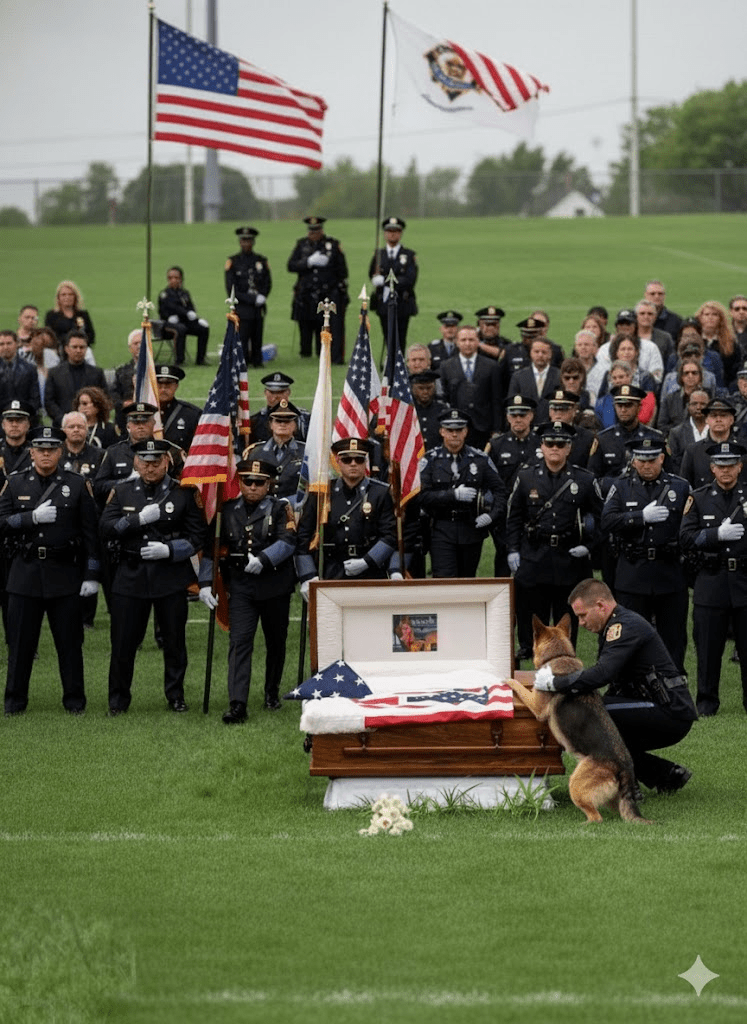 The air hung heavy with a grief that transcended human understanding at the memorial service for K9 Officer Ranger, a hero in every sense of the word. A flag-draped casket, adorned with the symbols of a nation he served with unwavering loyalty, rested amidst a phalanx of officers whose faces were etched with sorrow. Each salute was a testament to a life dedicated to duty, each tear a recognition of the profound loss. The solemnity of the occasion was almost unbearable, a palpable weight pressing down on the hearts of those gathered. Yet, as the final tributes were about to commence, an unforeseen participant would step forward, not with a eulogy of words, but with a gesture so powerful it would forever redefine the very essence of sacrifice and the unbreakable bonds forged in service. This was not merely a police memorial; it was a family’s farewell, destined to take an unexpected turn that would leave an indelible mark on all who witnessed it.