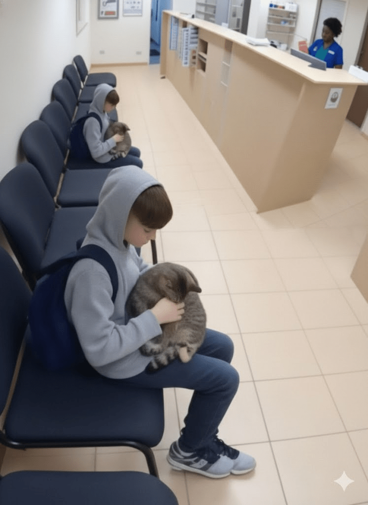 The story continues to unfold as the young boy, now with the cat safely in his arms, makes his way to what appears to be a veterinary clinic. This transition from street corner to a waiting room underscores the immediate and responsible decision made to seek professional help. The image of the boy cradling the cat while waiting, with the clinic’s reception area in the background, speaks volumes about his commitment. He’s not just passing the cat along; he’s actively participating in its rescue and recovery. The presence of a welcoming receptionist hints at the support system available for such situations, from the individual citizen to the community services designed to care for animals. It’s a powerful visual testament to the fact that compassion isn’t just about feeling sorry for an animal, but about taking tangible steps to alleviate its suffering and ensure its health. This scene encapsulates the critical link between recognition of need and the decisive action required to address it effectively.