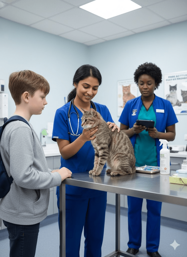 Next, we see the cat on the examination table, receiving professional attention from a compassionate veterinary team. A vet technician gently strokes the cat, reassuring it, while another medical professional seems to be documenting its condition. The boy stands nearby, his expression reflecting concern and hope, a silent witness to the care being provided. This scene is pivotal, illustrating the critical role of veterinary professionals in animal welfare. It highlights their expertise in diagnosing and treating conditions that laypeople might miss, underscoring the necessity of bringing rescued animals to a clinic for proper evaluation. The calm and systematic approach of the veterinary staff reinforces the idea that every animal deserves comprehensive medical care, regardless of its previous circumstances. This moment also marks a significant step towards the cat’s recovery, demonstrating the collaborative effort required for such rescues.