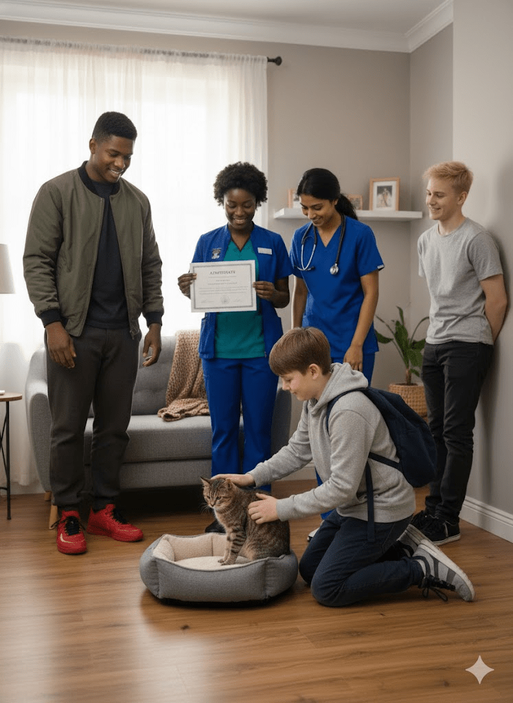The journey culminates in a truly heartwarming scene: the cat, now visibly healthier and comfortable, resting in its own bed. The young boy is kneeling beside it, gently petting it, while the adult from the initial street encounter, along with the veterinary team, stands by, smiling. One of the vet professionals holds up what appears to be an “adoption certificate,” signifying the cat’s new, permanent home. This final image beautifully encapsulates the full circle of compassion – from a chance encounter with a stray to a loving forever home. It’s a powerful testament to the impact of individual and collective efforts in animal rescue. The smiles on everyone’s faces reflect the joy and satisfaction that comes from making a tangible difference in a creature’s life. This moment celebrates not just the cat’s new beginning, but also the human capacity for empathy, responsibility, and unwavering kindness. It serves as a strong reminder that every act of compassion, no matter how small it seems, can lead to a profound and lasting positive outcome.