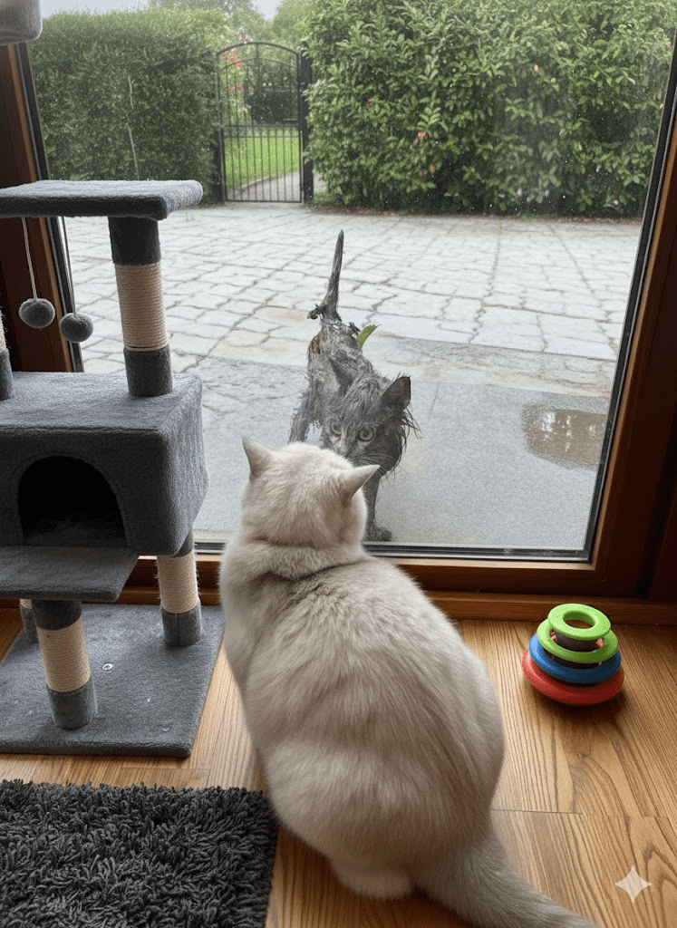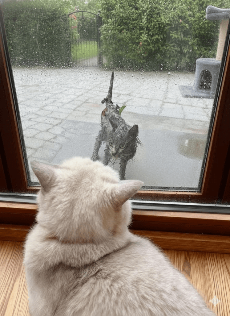 The image captures a poignant moment, a stark dichotomy between two worlds as experienced by our feline friends. Inside, a fluffy, pristine cat gazes out, its posture relaxed and its fur impeccably groomed, embodying the very essence of domestic comfort and security. Its eyes, though unseen, convey a sense of curiosity, perhaps even a touch of trepidation, as it observes the scene unfolding beyond the protective barrier of glass. Outside, a different narrative entirely, a testament to resilience and survival. A small, bedraggled kitten, soaked to the bone and smudged with what appears to be mud or dirt, stands at the threshold. Its fur is matted and clinging to its slender frame, revealing the harsh realities of an outdoor existence. This encounter, separated by a mere pane of glass, speaks volumes about the contrasting lives cats can lead—one sheltered, the other battling the elements. It’s a snapshot that evokes empathy, stirring questions about fate, fortune, and the thin line between warmth and vulnerability. The image is a silent conversation between two beings, one safe, one seeking, and invites us to ponder the inherent differences in their daily struggles and joys.