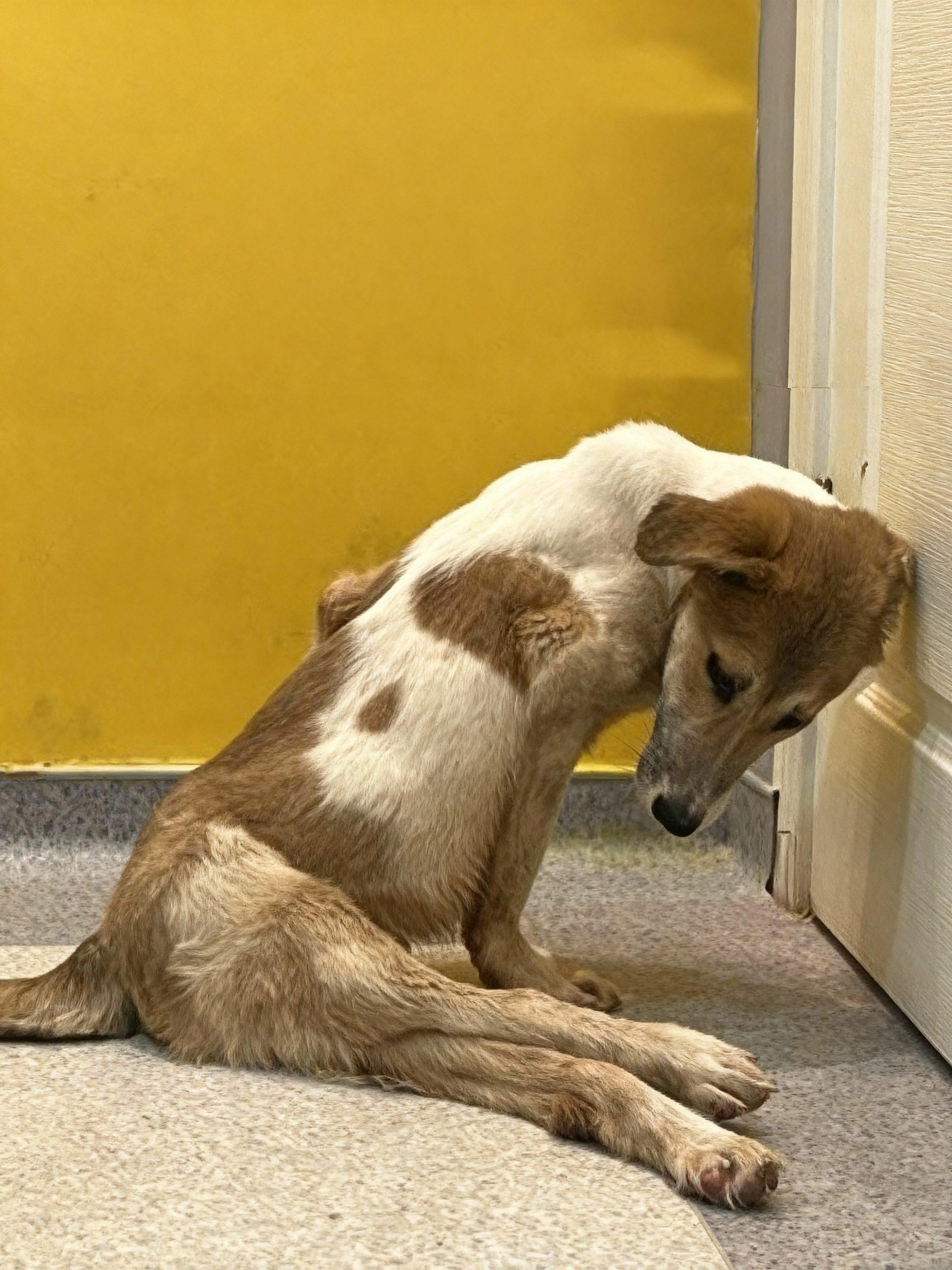 The image of a dog hunched against a wall, head down, and body language conveying clear distress, is a poignant…