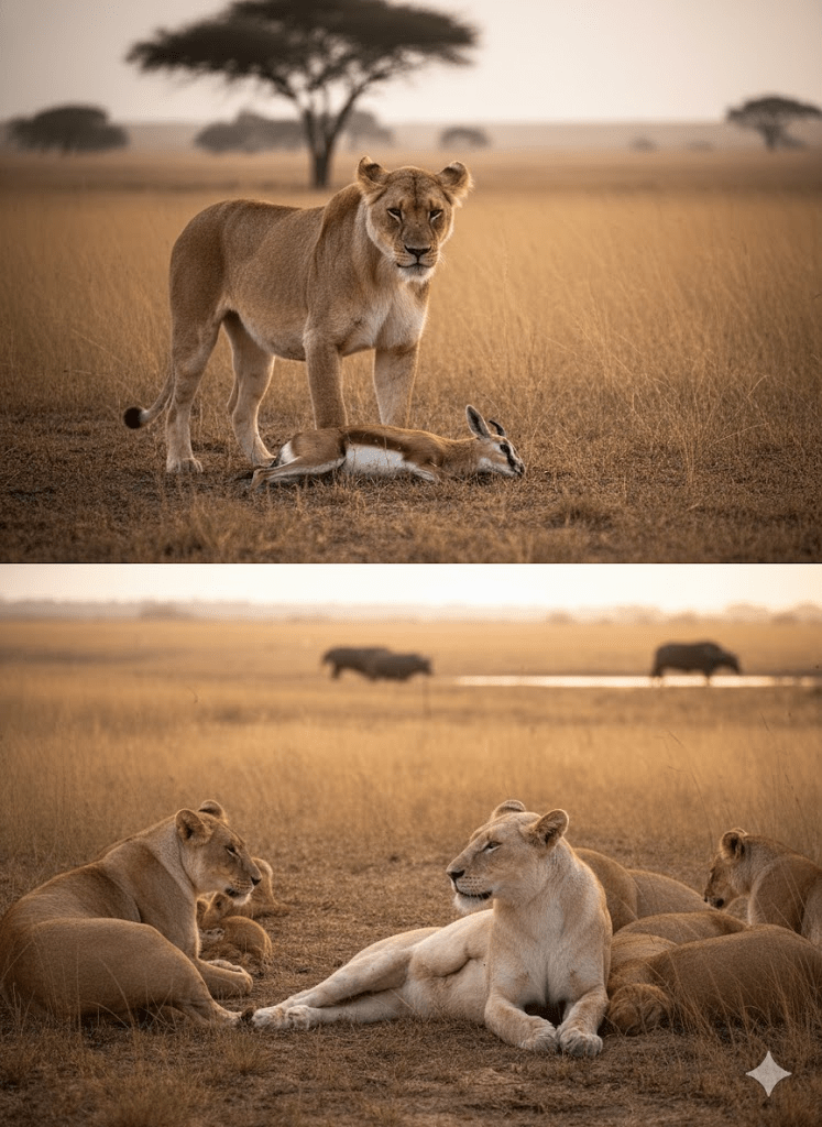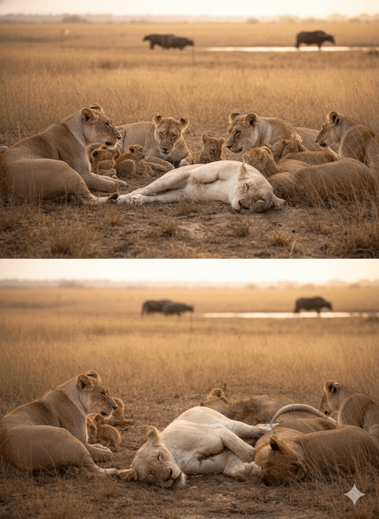 The golden hour cast long shadows across the savanna as the Birmingham Pride rested, but a silent tension hung heavy in the air. A young lioness, known for her spirited hunts and vibrant presence, lay gravely wounded, her flanks still bearing the fresh, brutal testament of a buffalo’s horn. The gash, alarmingly close to a vital artery, pulsed with a dark promise of fate, sending shivers through even the most hardened members of the pride. Her breaths were shallow, each one a fragile testament to her fading strength. The other lionesses, usually boisterous and playful, now moved with a somber grace, their tawny bodies forming a protective, quiet perimeter around their fallen sister. This wasn’t merely an injury; it was a crisis that threatened to unravel the very fabric of their familial unit, a stark reminder of the unforgiving wild where life and death dance on the edge of a blade. The question wasn’t if she would survive, but for how long, and what it would cost the pride to keep her flicker of life alive.