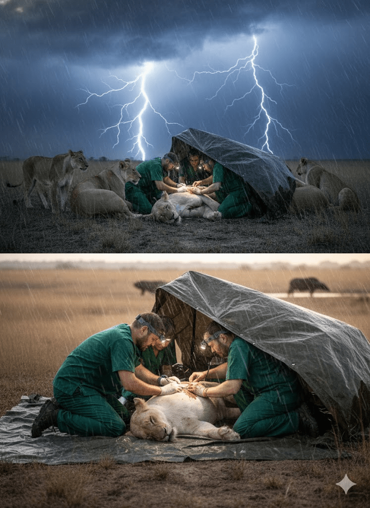 Conservation teams, alerted by tracking collars, arrived with a grim determination. The savanna, usually a stage for raw power, transformed into an emergency ward. The sedatives worked quickly, allowing veterinarians to approach the immense predator. The wound was worse than anticipated, a deep laceration that required immediate and meticulous attention. As they worked under the fading light, an unexpected development arose – a sudden, violent electrical storm erupted, turning the sky into a maelstrom of crackling energy. Rain lashed down, threatening to contaminate the sterile field and complicate the delicate procedure, forcing the team to construct a makeshift shelter with incredible speed and ingenuity, battling not just the injury but the raging elements.