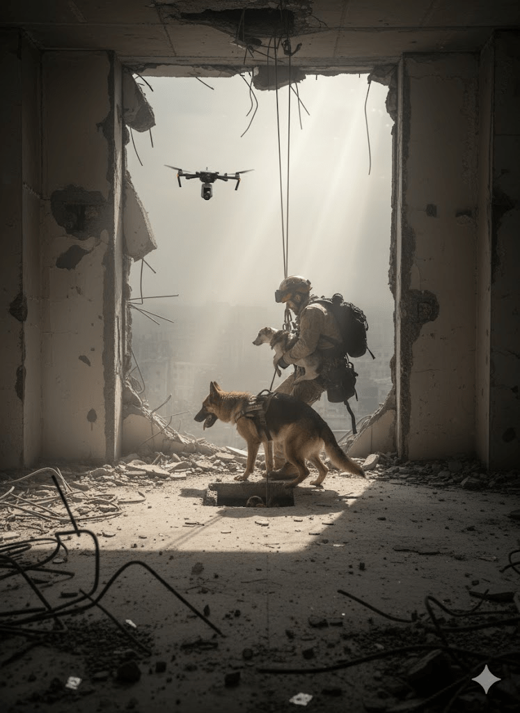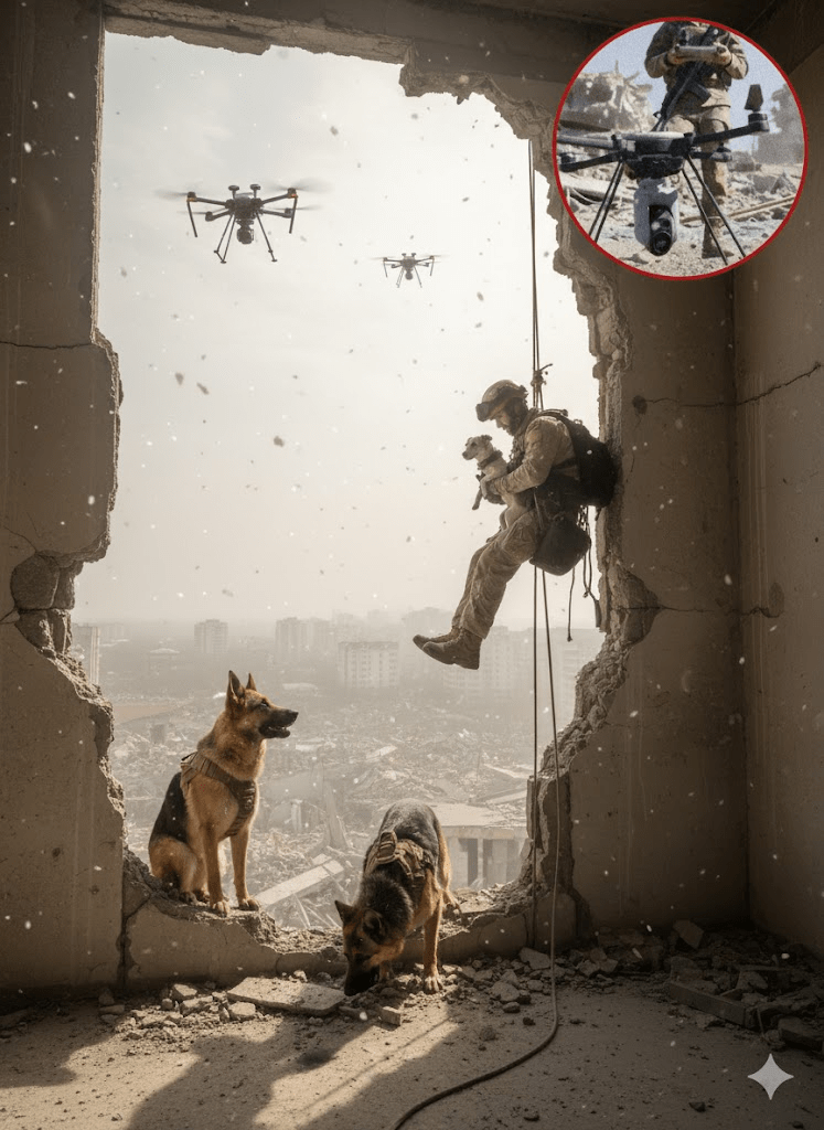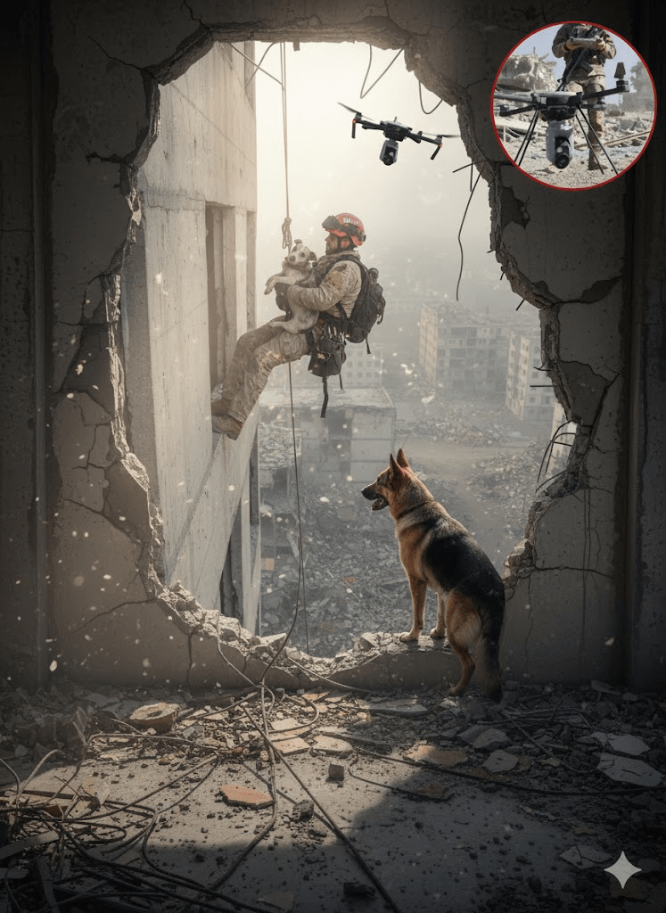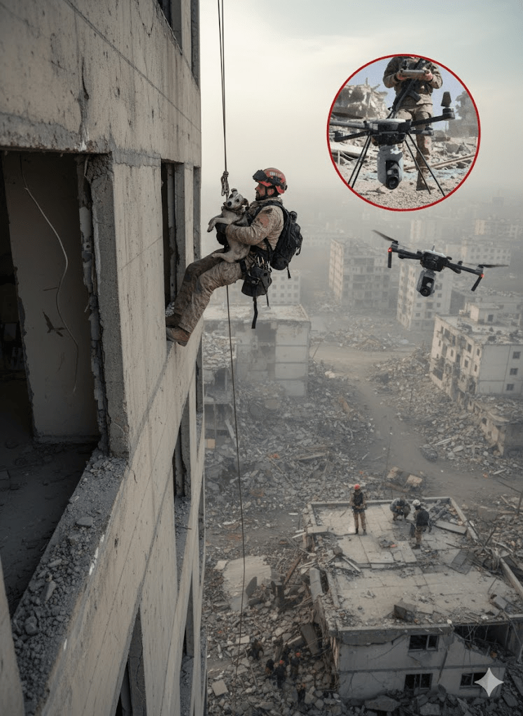 In the harrowing aftermath of conflict and disaster, when the dust settles and the world reckons with destruction, a silent testament to resilience often emerges. It’s found in the unwavering dedication of search and rescue teams, whose perilous work embodies the very essence of courage and compassion. The striking image before us captures such a moment: a rescuer, suspended precariously from a height, carefully cradling a small dog, both surveying the devastation below. This single frame speaks volumes about the human-animal bond, the advanced tools now employed in these critical missions, and the profound hope these operations bring to communities shattered by catastrophe. It’s a stark reminder that amidst the rubble and despair, the relentless pursuit of life, be it human or animal, continues, driven by an extraordinary commitment to service. The intricate ballet of technology, human skill, and canine instinct weaves together to paint a picture of enduring hope against the bleakest backdrops. The inclusion of the drone operator in the inset further emphasizes the evolving nature of these missions, where technological advancements are now as crucial as the bravery of the individuals on the ground.