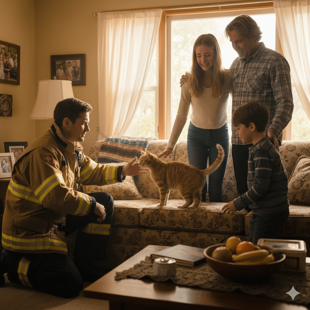 In the midst of a roaring inferno, where acrid smoke choked the air and the very structure of a home groaned under the assault of the flames, an unimaginable scene unfolded. Firefighter Jake Harrison, a veteran of countless blazes, pushed deeper into the chaos, his breath ragged behind his oxygen mask, his senses overwhelmed by the heat and the deafening crackle of burning timber. He was searching for any sign of life, a desperate hope clinging to his resolve, when a faint, terrified whimper cut through the din. It led him not to a person, but to a small, trembling bundle of orange fur, cowering amidst collapsing debris – a cat, soot-covered and clearly overwhelmed, yet miraculously alive. The moment Jake scooped her up, a profound connection, unspoken yet powerful, seemed to ignite even as the world around them burned. He cradled her close, her small body pressed against his turnout gear, a silent promise made in the heart of destruction. The photograph taken moments after they emerged, capturing the tender exchange between rescuer and rescued, would soon become a symbol far beyond their wildest imaginings.