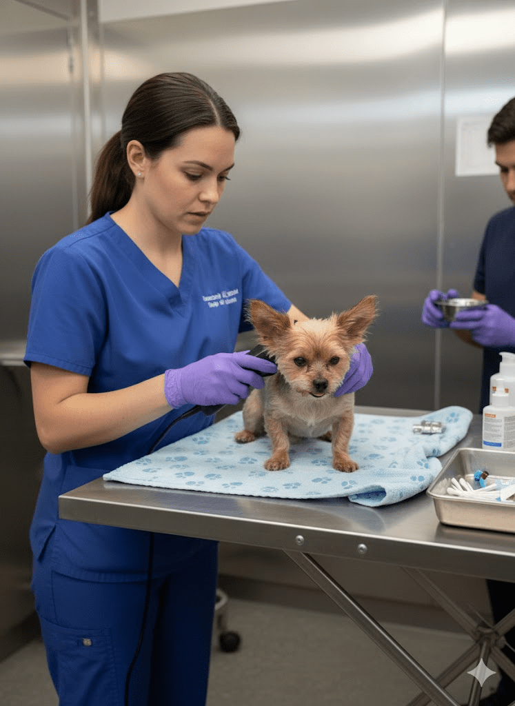 Upon arrival at the rescue center, the terrier’s condition was immediately assessed as critical. Her body was a roadmap of neglect: severe alopecia, indicating advanced skin disease; emaciation that left her bones prominent beneath her thin skin; and a general air of exhaustion that spoke volumes of her prolonged suffering. The veterinarians and support staff moved with practiced urgency, their movements a choreography of care. Initial blood tests were drawn, a gentle physical examination was conducted, and a careful cleansing of her matted fur began, revealing the extent of her skin’s irritation and infection. Every touch was deliberate, every whispered word intended to soothe her fragile nerves. It was clear she hadn’t known kindness in a long time, flinching at first, but slowly, tentatively, beginning to relax into the gentle hands that offered comfort rather than cruelty.
