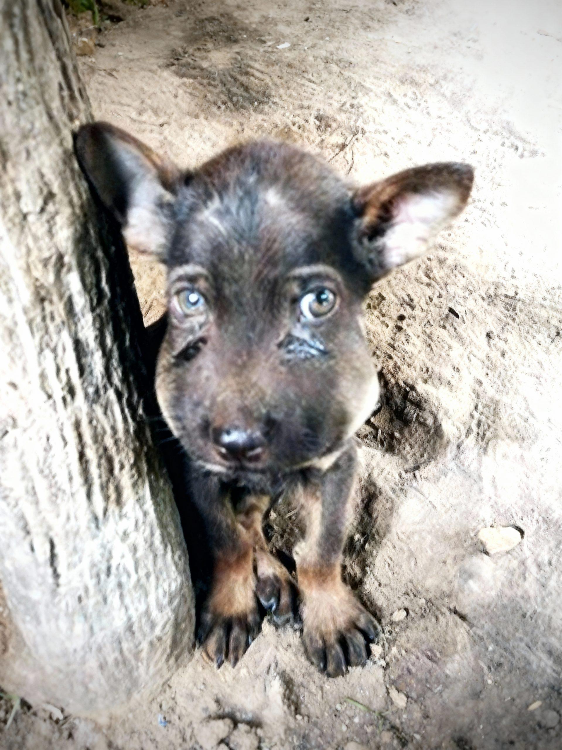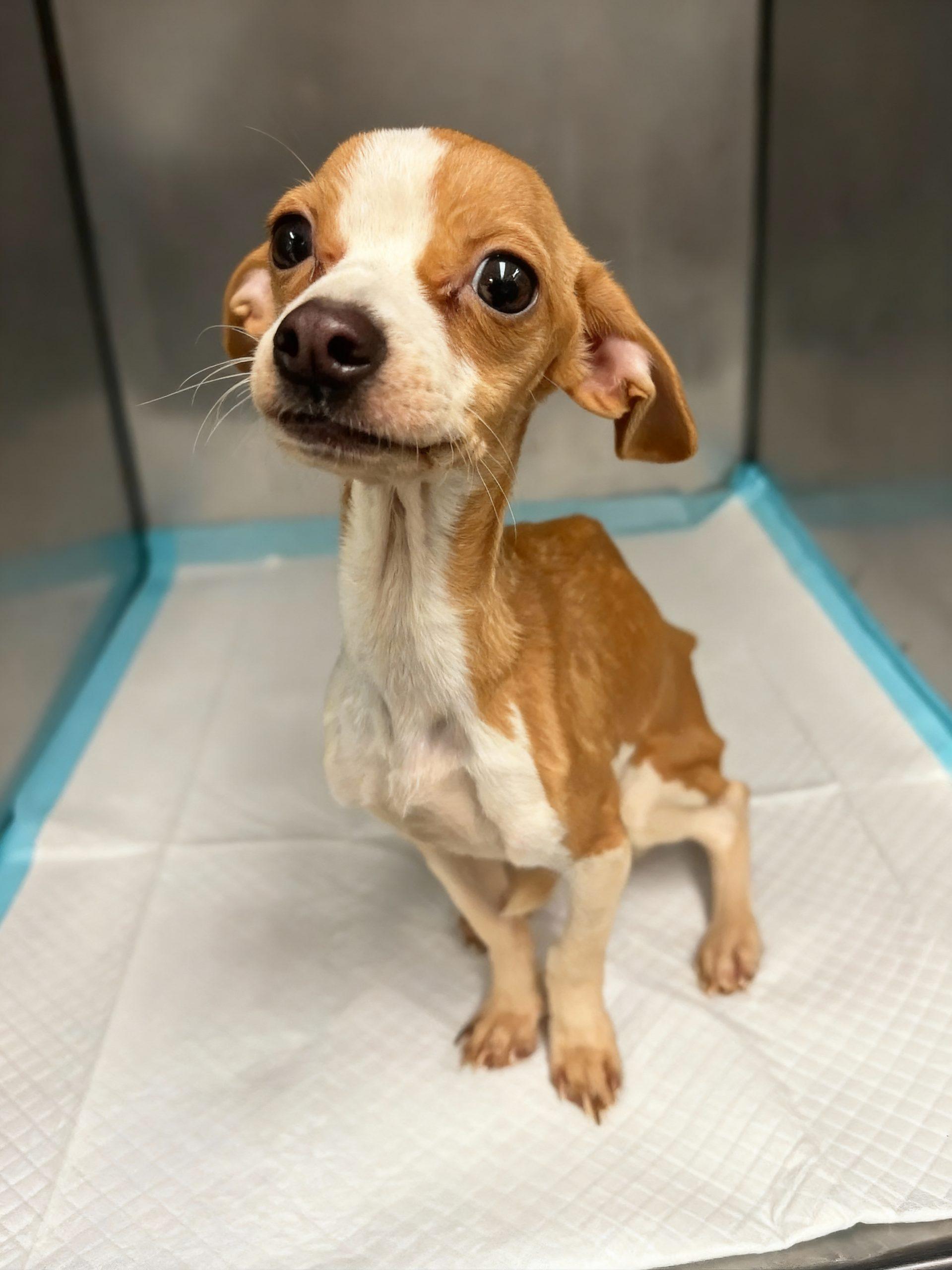 The image above captures a moment of raw vulnerability, a small chihuahua-mix puppy with soulful eyes looking up, perhaps with…