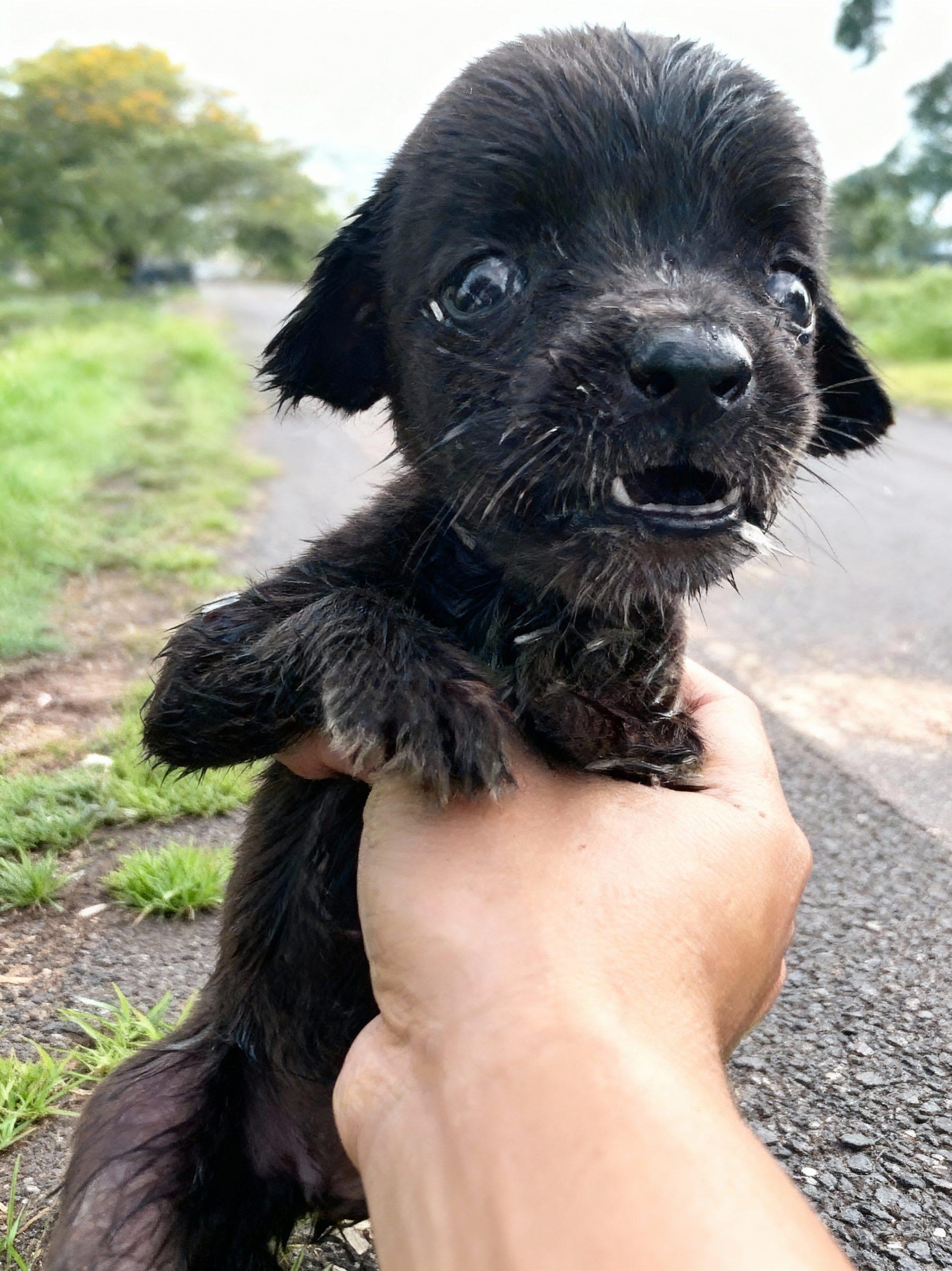 The image before us tells a poignant story. A tiny, black puppy, no more than a few weeks old, is…