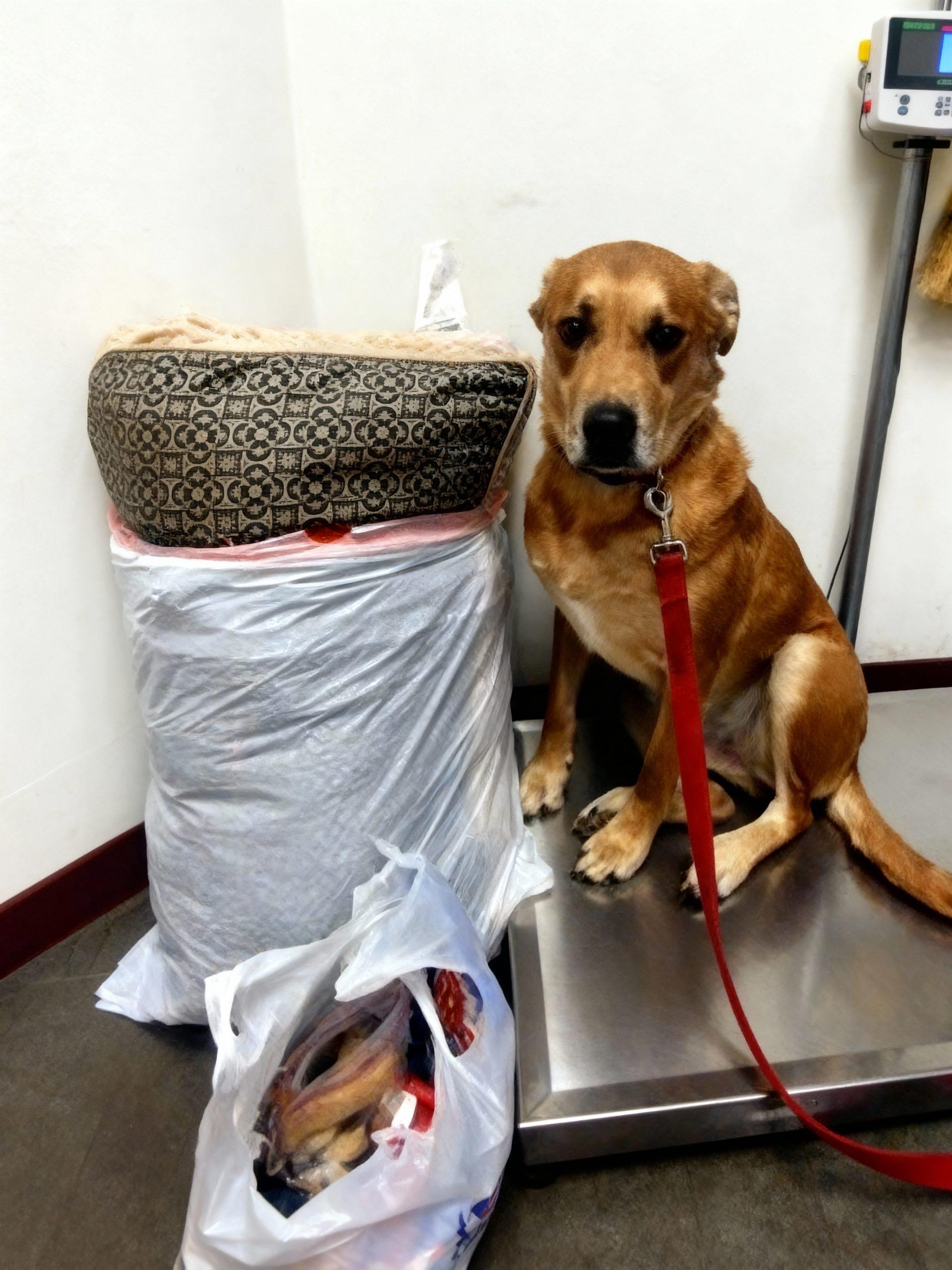 The image of a dog, a loyal companion, sitting on a cold scale with a bag of belongings next to…