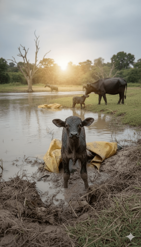 The image before us is a poignant testament to the harsh realities faced by vulnerable creatures in challenging environments. It depicts a young animal, possibly a calf, partially submerged in mud and water, with a yellow tarpaulin offering a meager, perhaps insufficient, cover. The scene evokes a sense of struggle, vulnerability, and the constant battle for survival against environmental odds. While the exact circumstances leading to this predicament are unknown, the image powerfully symbolizes the struggles many animals endure due to natural disasters, habitat degradation, or the simple, unforgiving hand of nature. It compels us to consider the broader implications of such situations, urging us to reflect on the delicate balance of ecosystems and the impact of human activity and climate change on the animal kingdom. This visual narrative serves as a stark reminder that beneath the surface of our often-abstract discussions about environmental challenges, there are tangible, heartbreaking realities for individual beings.