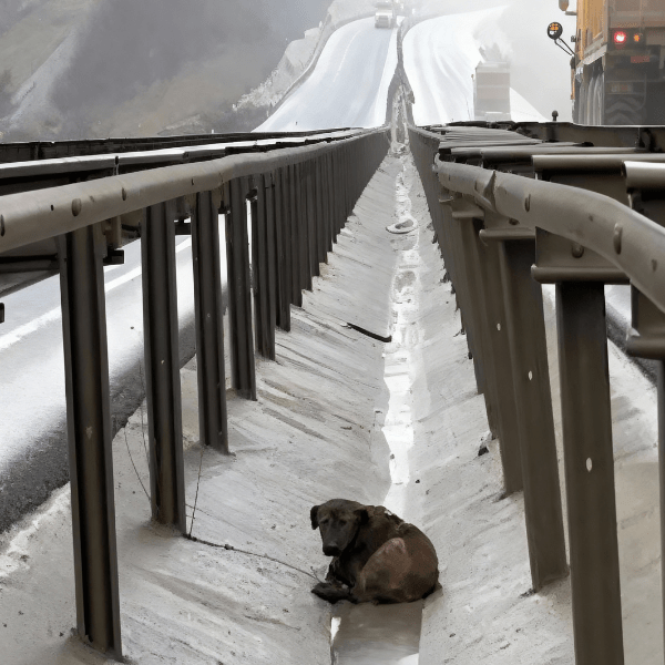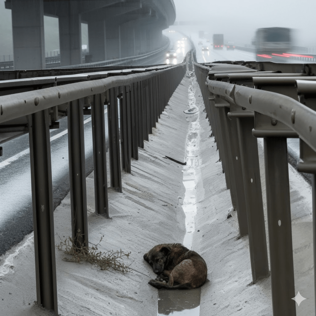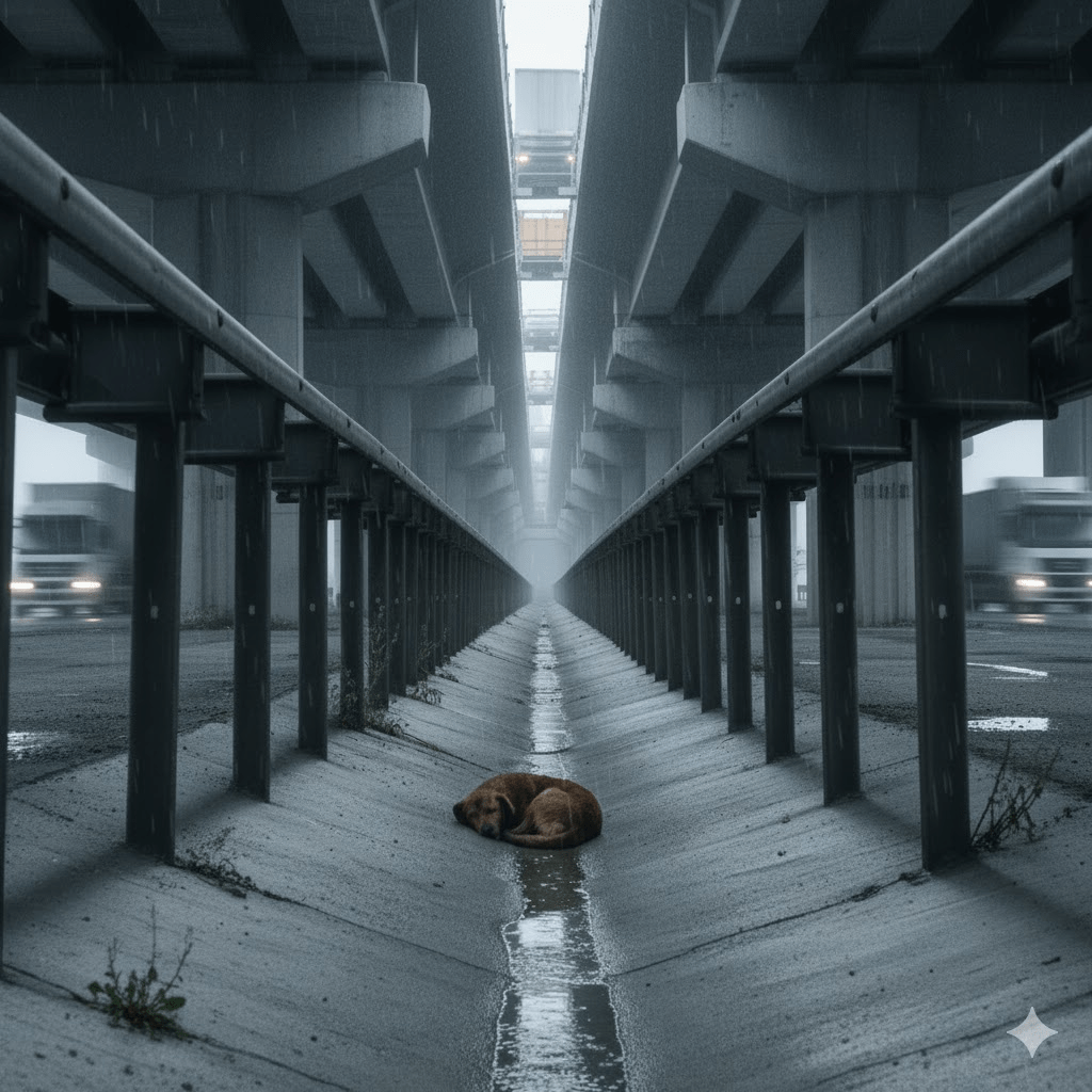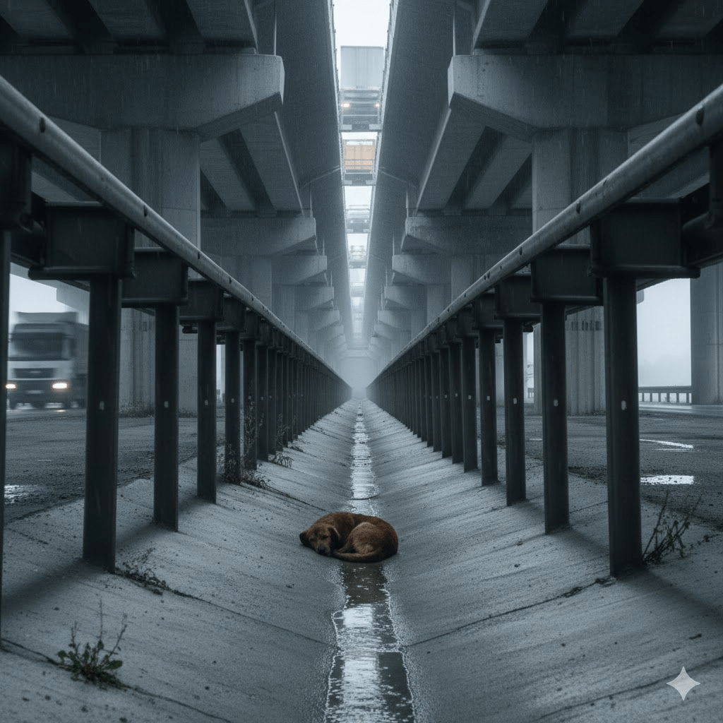 The modern highway system, a marvel of engineering, represents connectivity, progress, and the relentless hum of human activity. Designed for speed and efficiency, these concrete arteries pulse with vehicles, carrying goods and people across vast distances. Yet, often overlooked amidst the rush are the silent sentinels, the forgotten inhabitants of the margins, whose lives intersect with these thoroughfares in poignant and sometimes perilous ways. The image before us captures a stark reality: a lone dog, its body curled in a posture of resignation or rest, nestled within the drainage channel of a highway overpass. This isn’t merely a stray animal; it’s a testament to the unforeseen consequences of our sprawling infrastructure, a living embodiment of resilience in the face of indifference, and a stark reminder that our built environments have an ecological and social footprint far beyond their intended purpose. The cold, utilitarian lines of the bridge railings, the damp concrete, and the distant, blurred traffic all contribute to an atmosphere of isolation. This single image compels us to look closer, to question the narratives we construct around development, and to acknowledge the myriad lives that persist, often unseen and unheard, within the very structures we create to define our civilization. It prompts a deeper inquiry into how our infrastructure impacts local wildlife, the ethics of animal welfare in urban and peri-urban environments, and the collective responsibility we bear for the creatures who share our rapidly expanding world.