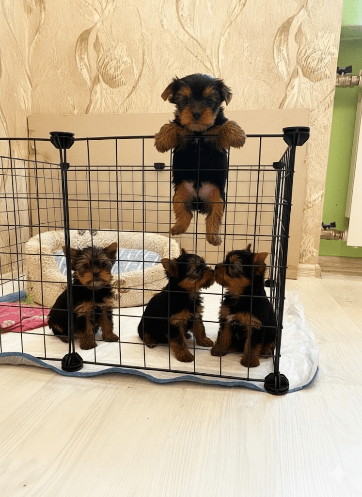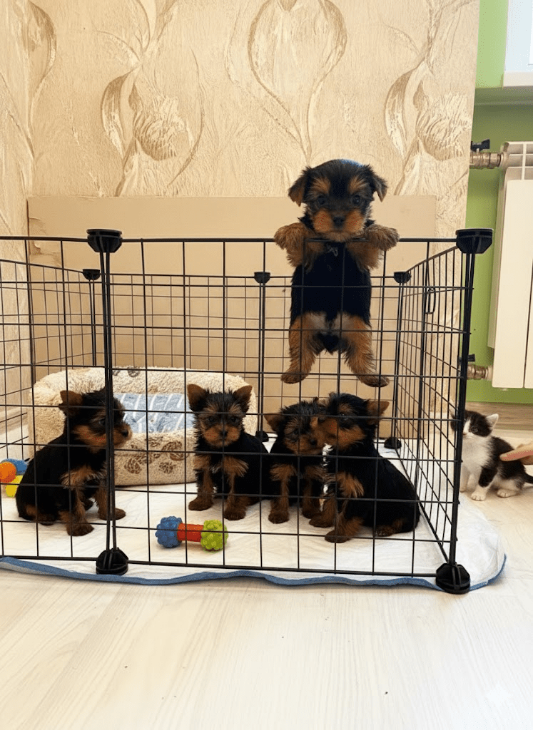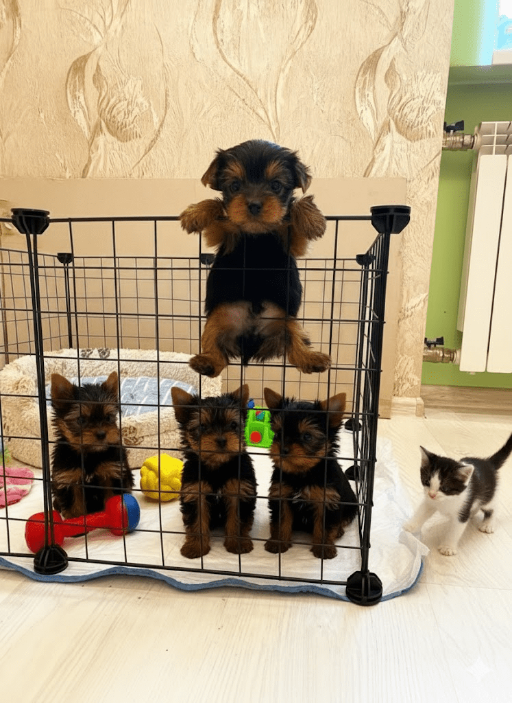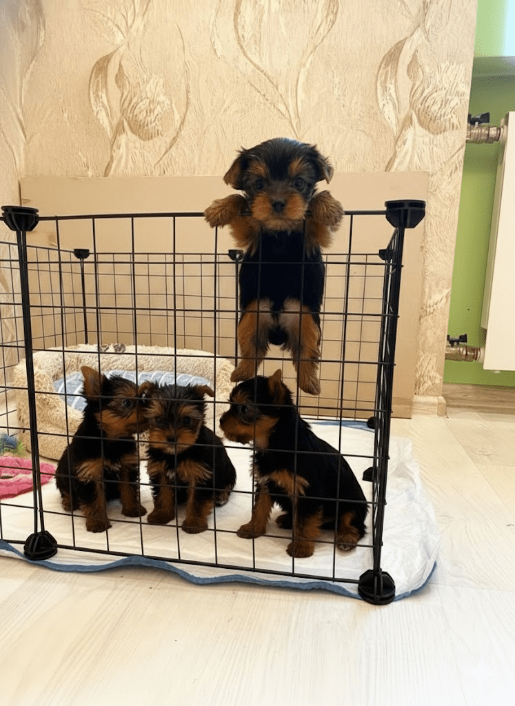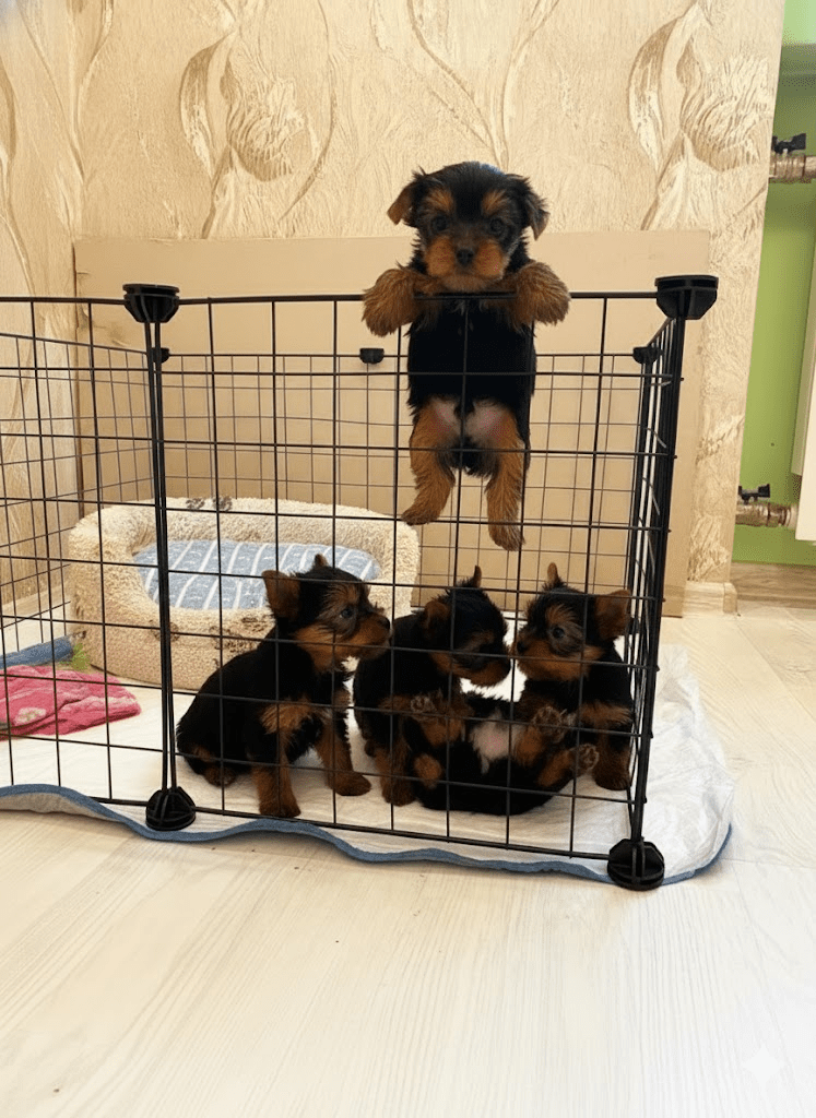In the captivating image before us, a quartet of tiny Yorkshire Terrier puppies presents a scene that is both endearing and illuminating for anyone interested in canine behavior. Three of the pups are settled within the confines of a playpen, their small forms huddled together, perhaps resting or observing their surroundings with nascent curiosity. However, it’s the fourth puppy that truly steals the spotlight, suspended comically from the top edge of the enclosure, a tiny Houdini mid-escape. This single snapshot offers a rich tapestry for discussion, from the inherent adventurous spirit of puppies to the critical stages of their development, and the importance of providing a safe yet stimulating environment. It’s a vivid reminder that even at a very young age, puppies are not just cute bundles of fur, but complex beings already demonstrating individuality, problem-solving skills, and a strong drive to explore their world. Their interactions with their environment and with each other in these early weeks lay the groundwork for their future personalities and behaviors, making this period a fascinating window into the unfolding lives of our beloved canine companions.