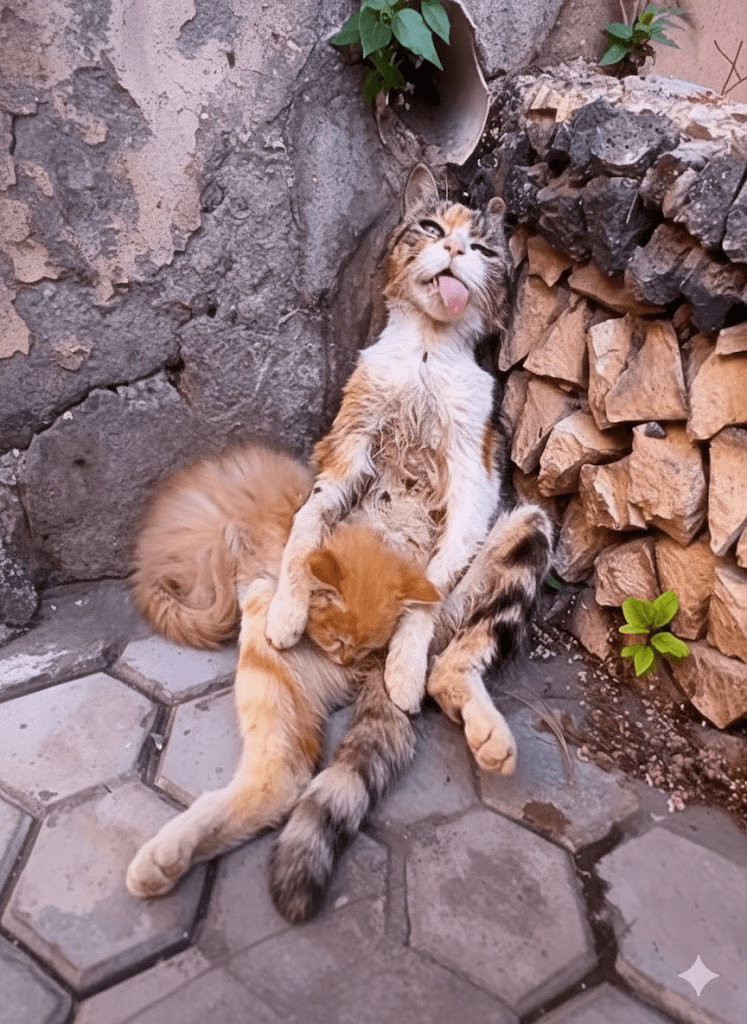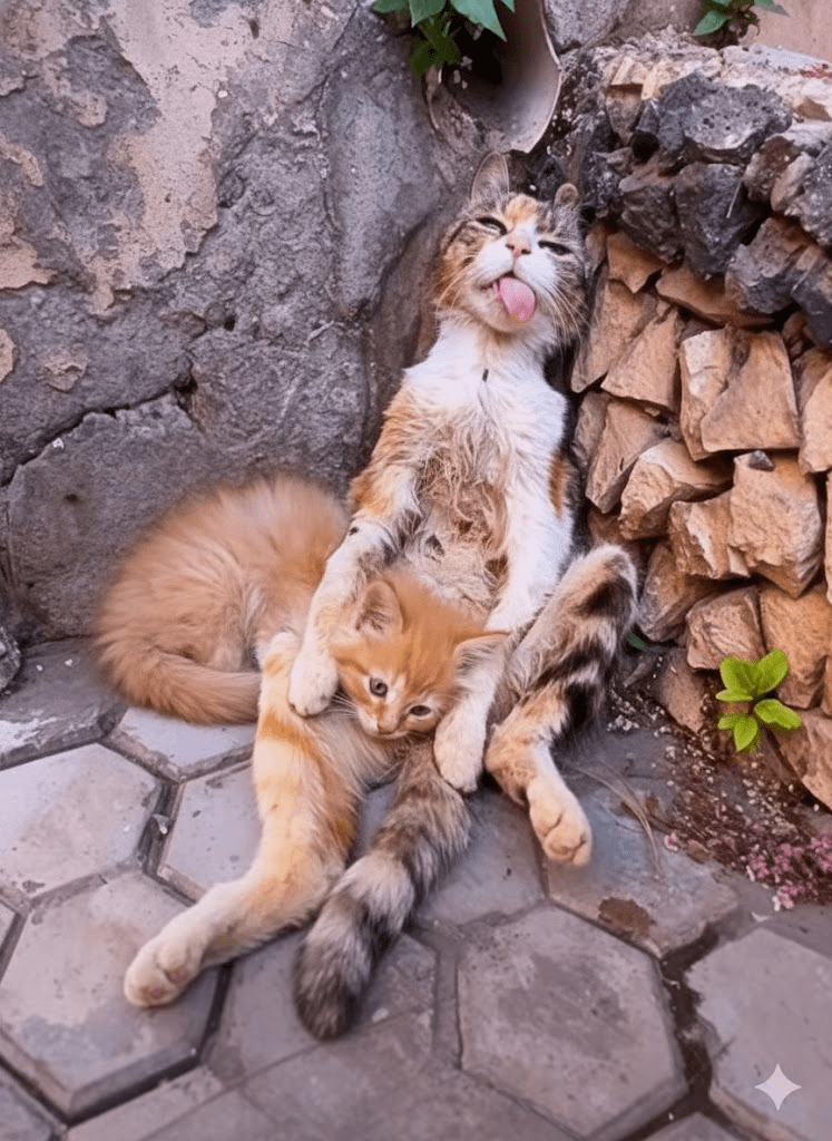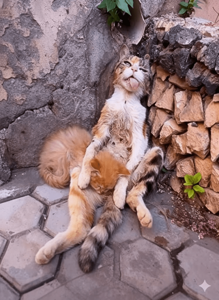 In the bustling theater of urban life, where every moment is a scramble for survival, there exist pockets of profound tranquility, often unnoticed by the hurried gaze. Our featured image captures one such serene tableau: a calico cat, a veteran of countless street sagas, sprawled in a posture of unadulterated bliss, tongue playfully lolling, eyes half-closed in a dreamlike state. Beside her, nestled in the protective curve of her body, two ginger kittens epitomize youthful abandon—one curled in deep slumber, the other perhaps just stirring, a tiny sentinel of emerging awareness. This isn’t merely a snapshot of a cat and her offspring; it’s a living canvas depicting the profound art of relaxation, resilience, and unconditional comfort amidst the raw backdrop of weathered stone and worn pavement. The scene is a testament to the universal need for respite, a vivid reminder that even in the most challenging environments, life finds a way to embrace moments of pure, unadulterated peace. It compels us to pause, observe, and perhaps learn a thing or two about finding our own centers of calm.