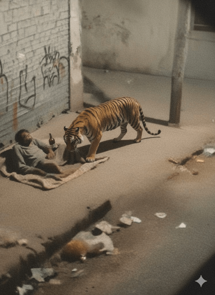 In the quiet, often overlooked alleys of a bustling metropolis, where the city’s ceaseless rhythm softens to a whisper, a tale unfolded that defies belief and challenges our perceptions of the wild. It began as a series of unsettling reports: a large tiger, a creature of raw power and untamed majesty, had been sighted roaming the urban sprawl, leaving a trail of fear and unanswered questions in its wake. Authorities scrambled, traps were set, and a collective sense of unease settled over the population, transforming familiar streets into zones of nervous caution. Yet, amidst this heightened alert, an extraordinary and deeply ironic encounter took place, far from the prying eyes of surveillance teams, involving a man on the margins of society and the very beast that had become the city’s most feared enigma. It was a night when the lines between predator and companion blurred, all under the dim, indifferent glow of a flickering streetlamp.