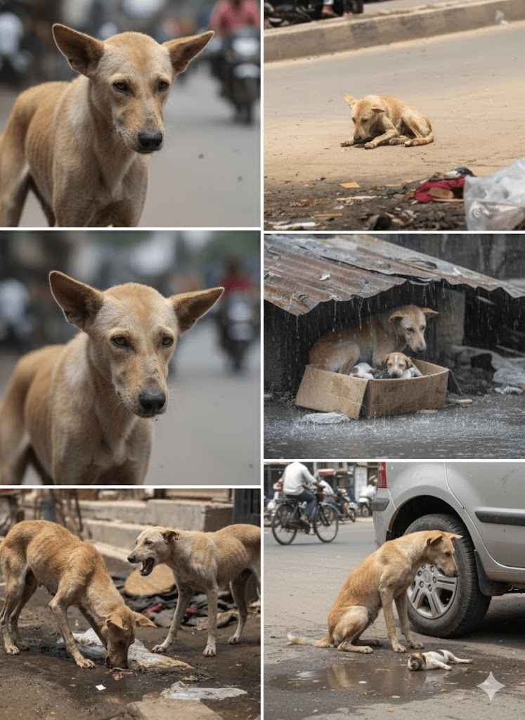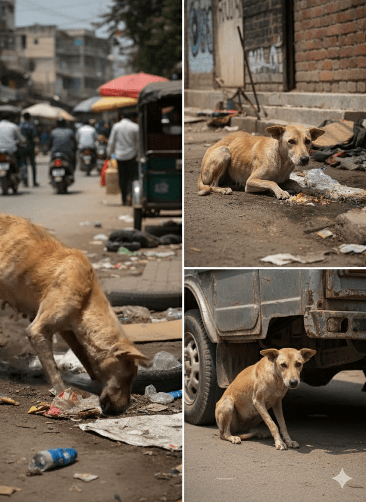 The image before us is a poignant, unedited snapshot of a reality far too common in many parts of the world: the daily struggle for survival faced by street dogs. It’s a scene that immediately elicits a complex mix of emotions – empathy, concern, and perhaps a stark awareness of the disparity in life. We see a dog, emaciated and clearly unwell, desperately trying to find sustenance in what appears to be discarded scraps on a dirty street. Its ribs are visible, a testament to prolonged hunger, and its posture speaks of weariness and vulnerability. The environment is harsh; the ground is grimy, littered with refuse, and the faint blur of a passing vehicle in the background hints at the indifferent rush of human life continuing around this creature’s silent plight. This single image, devoid of embellishment or artistic staging, cuts through the noise to highlight the raw, unfettered existence of these animals, inviting us to look beyond the immediate visual and ponder the broader implications of such widespread neglect. It’s a silent plea, a stark reminder of the countless forgotten lives that navigate our urban landscapes, often unseen and unheard, enduring a constant battle against hunger, disease, and the elements. The dog’s very act of survival, stooping to consume whatever meager offerings it can find, is a powerful and heart-wrenching narrative in itself, compelling us to consider the ethical dimensions of our co-existence with these sentient beings.
