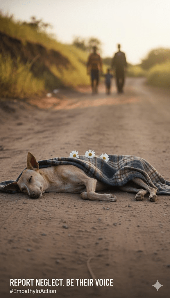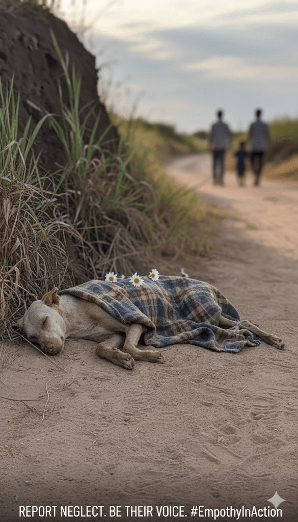 The image before us is a stark, unsettling tableau that immediately arrests the gaze and stirs a deep sense of disquiet. It depicts a canine, likely a dog, lying motionless on what appears to be sandy or dusty ground, nestled against a backdrop of dark earth and sparse, dry vegetation. The animal’s posture is one of complete surrender, its body emaciated to an alarming degree, ribs painfully prominent beneath a thin, matted coat. Its head is turned slightly, revealing an open mouth and what could be interpreted as a final, silent cry. The eyes, though not clearly visible, seem to convey an absence, a void where life once flickered. The forelegs are splayed, paws open, while the hindquarters are contorted, suggesting either rigor mortis or a desperate struggle in its final moments. A patch of darker fur or perhaps even decay is visible on its lower back, further emphasizing the dire state of its existence. The surrounding environment offers little comfort: dry grass stalks stand testament to a parched landscape, and the earthen bank behind suggests a forgotten, desolate location. There’s an undeniable rawness to the scene, an unfiltered portrayal of suffering that transcends species. This isn’t just an image of a deceased animal; it’s a profound visual narrative of neglect, abandonment, and the agonizing process of a life fading away, unnoticed and unhelped. It forces us to confront uncomfortable truths about our relationship with the creatures we share our world with, compelling us to look beyond the surface and consider the silent stories of countless others who endure similar fates.
