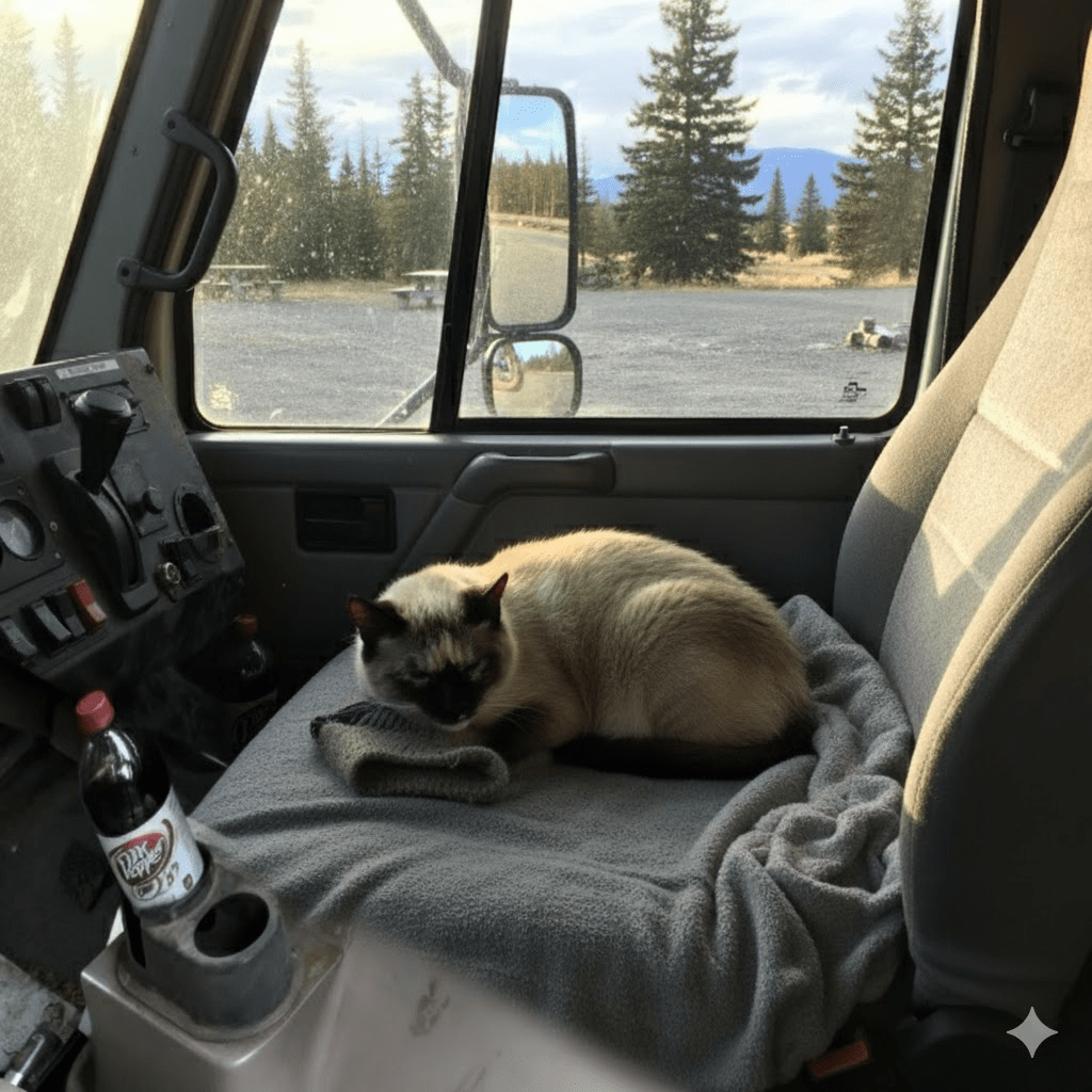 The interior of the truck cab itself tells a story of a life lived on the road. The wear and tear on the dashboard, the collection of switches and levers, and the seemingly custom-fitted cup holder for the Dr. Pepper all speak to the practicalities of a driver’s daily existence. This is not a pristine, showroom vehicle, but a working machine, adapted to the needs and preferences of its operator. The presence of the cat further humanizes this space, adding an element of warmth and individuality to an otherwise purely functional environment. It transforms the cab from a mere workspace into a mobile home, reflecting the driver’s personality and priorities. The subtle details, like the small pieces of fabric or paper tucked into crevices, hint at a driver who has found ways to personalize their space, making it more comfortable and efficient. This meticulousness in personalizing a professional space is a common trait among those who spend a significant portion of their lives within its confines, and the cat is the ultimate personal touch.