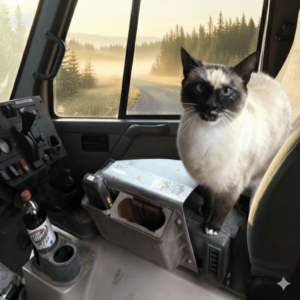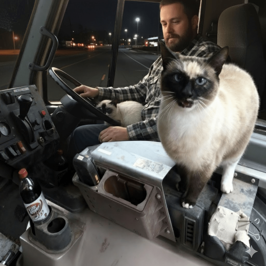 In the bustling world of logistics and transportation, where efficiency and punctuality reign supreme, it’s rare to encounter a sight that truly breaks the mold. Trucking, by its very nature, is a solitary profession, often involving long stretches of highway and quiet nights in the cab. Drivers become accustomed to their own company, finding solace in the rhythmic hum of the engine and the ever-changing landscape outside their window. However, sometimes, a four-legged friend decides to challenge this status quo, turning a functional workspace into a heartwarming home away from home. The image before us captures one such extraordinary partnership: a beautiful Siamese cat, with striking blue eyes and a distinctive dark mask, perched confidently on the dashboard of what appears to be a well-worn yet functional truck cab. This feline co-pilot, with its mouth slightly ajar as if mid-meow or perhaps offering some sagely navigation advice, instantly sparks curiosity. It’s a powerful visual, juxtaposing the rugged, utilitarian interior of a commercial vehicle—complete with its array of dials, switches, and a rather fitting bottle of Dr. Pepper—with the soft, domestic presence of a pet. This isn’t just a pet riding along; this is a cat that seems to have integrated itself seamlessly into the life of a long-haul driver, transforming the sterile environment into something far more personal and endearing. It raises questions about the human need for companionship, the adaptability of animals, and how even in the most unconventional settings, comfort and connection can thrive. This image invites us to look beyond the immediate scene and consider the deeper narrative of life on the road, enriched by an unexpected companion.