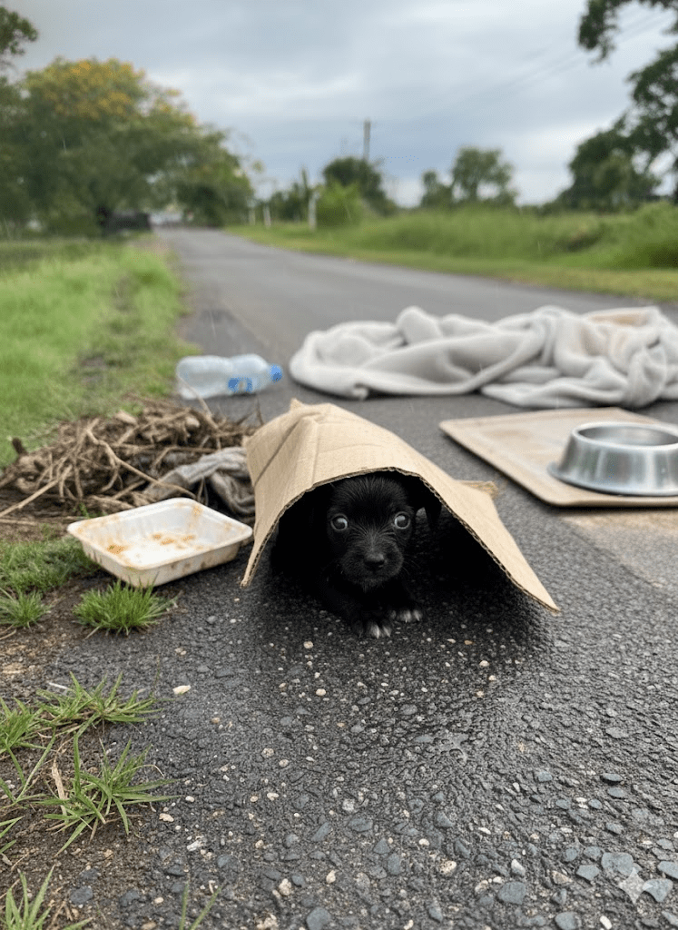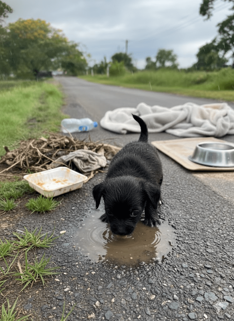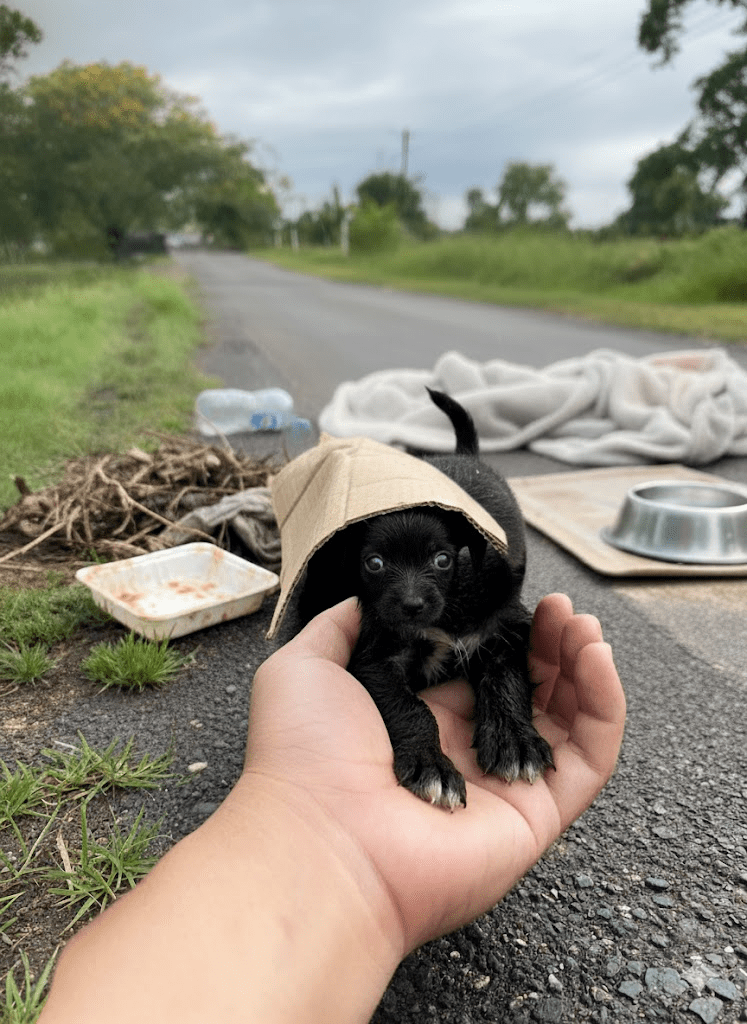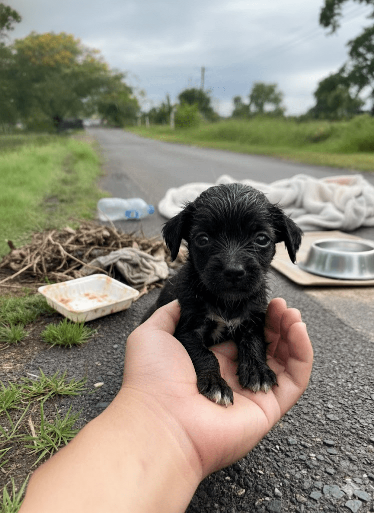 The image before us tells a poignant story. A tiny, black puppy, no more than a few weeks old, is being held gently in a human hand. Its fur is wet and matted, its eyes wide with a mixture of fear and perhaps a glimmer of hope. The setting appears to be a rural road, suggesting this little one was found alone, vulnerable, and exposed to the elements. This single photograph encapsulates the harsh reality faced by countless stray animals worldwide – a reality of abandonment, struggle, and the constant fight for survival. It prompts us to consider the immense challenges these innocent creatures endure from their very first breath, often without the warmth of a mother’s care or the security of a safe home. This particular puppy, with its small, frail body and questioning gaze, serves as a powerful reminder of the profound responsibility we, as humans, bear towards the animals that share our world, especially those left to fend for themselves on the streets. Its presence in that outstretched hand signifies a moment of intervention, a potential turning point from a life of hardship to one of safety and love.