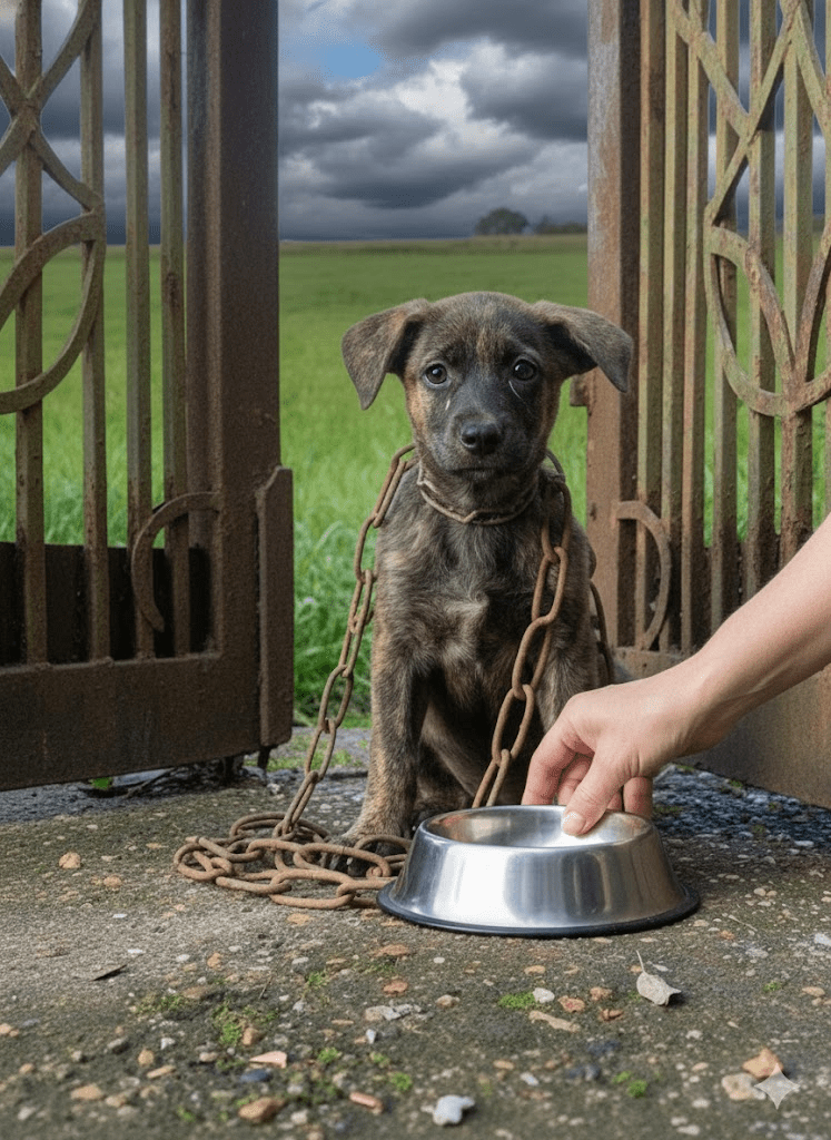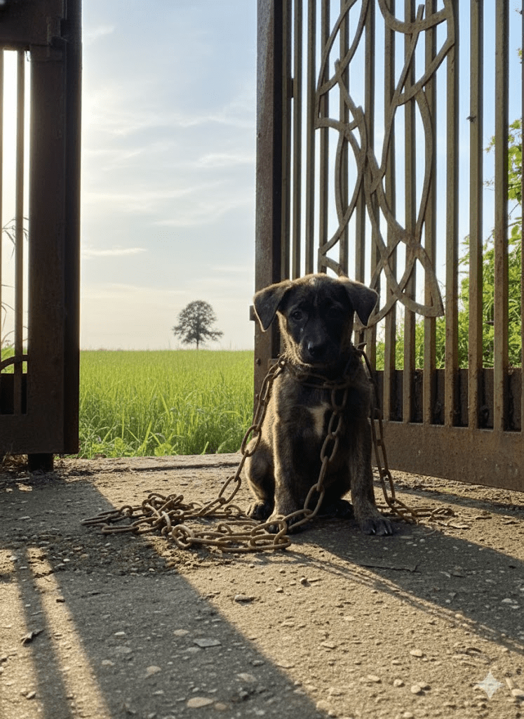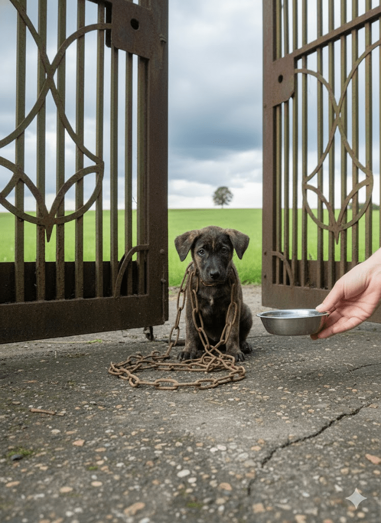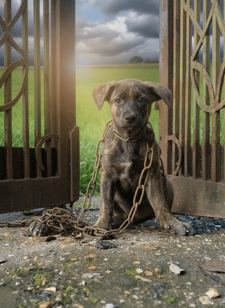 The image of a small, brindle-coated puppy, its innocent eyes reflecting a mix of fear and confusion, entangled in heavy, rusted chains before an imposing metal gate, is more than just a photograph; it is a stark, heart-wrenching narrative. It speaks volumes about vulnerability, neglect, and the silent suffering of countless animals worldwide. This isn’t merely a scene captured by chance; it represents a pervasive issue that demands our immediate attention and unwavering compassion. The heavy chains, designed for restraint, ironically highlight the fragility of the creature they bind. The puppy’s small stature is dwarfed by the imposing, unyielding metal, creating a poignant contrast between innocence and the harsh realities it faces. This visual metaphor extends beyond this single animal, symbolizing the larger systemic problems of animal abandonment, abuse, and the urgent need for advocacy and intervention. Every link in that chain tells a story of neglect, a story that begins with a desperate plea for freedom and ends with a call to action for those willing to listen and act. We are compelled to look beyond the surface, to understand the deeper implications of such an image, and to commit ourselves to fostering a world where no animal ever experiences such profound despair.