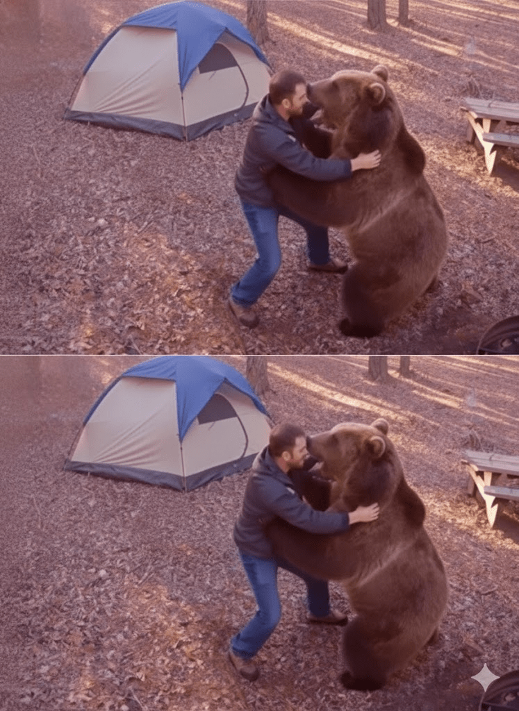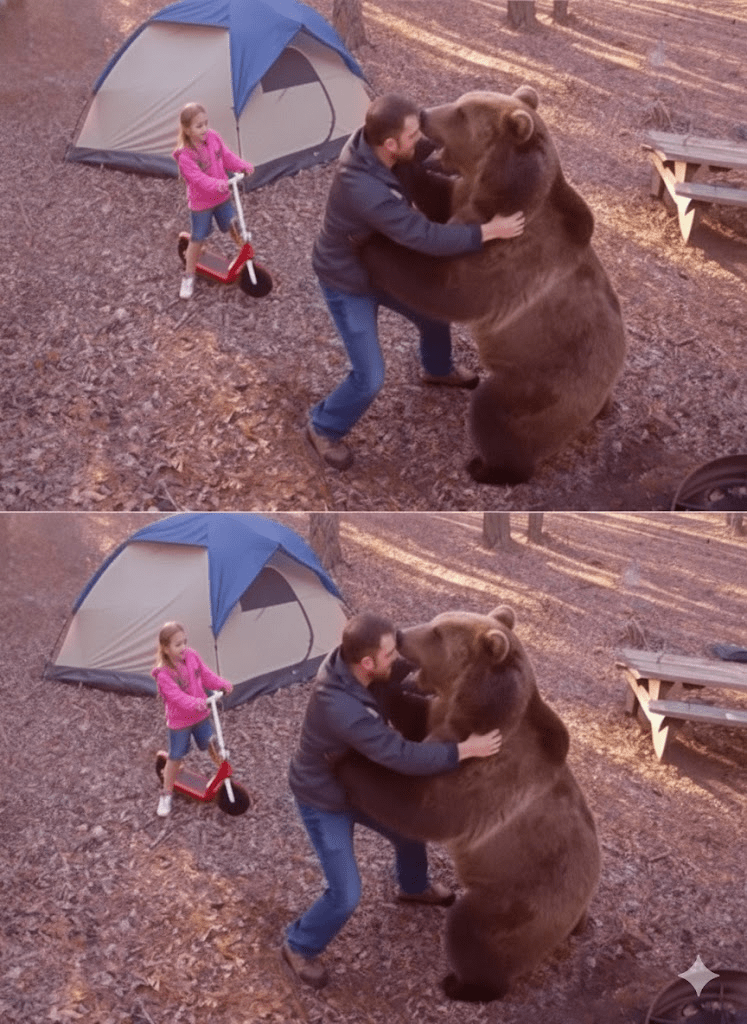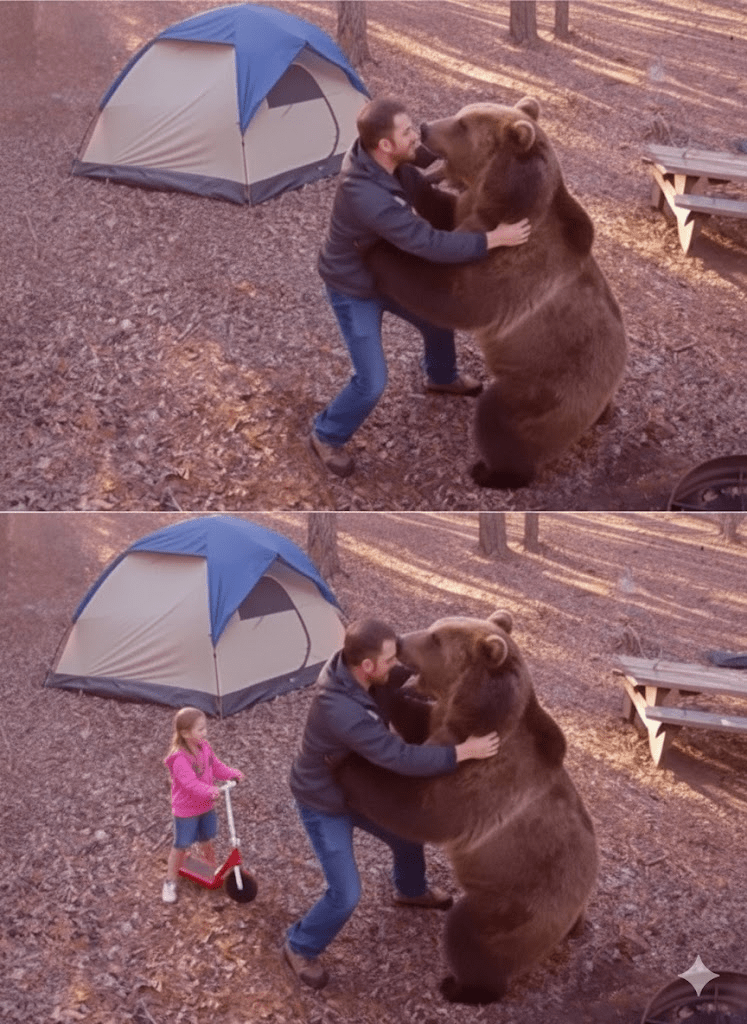 In a world increasingly shaped by human development, the boundaries between our lives and the wild continue to blur. While often portrayed as a source of conflict or danger, the potential for profound and even heartwarming interactions between humans and wild animals remains a captivating subject. The image before us, depicting a man embracing a bear with a young girl on a scooter observing nearby, challenges conventional narratives and invites us to ponder the deeper implications of such an encounter. It speaks to a rare moment of apparent harmony, prompting us to consider not just the immediate circumstances of this particular scene, but the broader spectrum of human-wildlife coexistence, the ethics of interspecies relationships, and the inherent draw we feel towards the natural world. This scene, both unusual and compelling, serves as a powerful metaphor for the delicate balance we strive to maintain with nature and raises questions about trust, respect, and the unexpected connections that can form when we step beyond our preconceived notions of the wild.